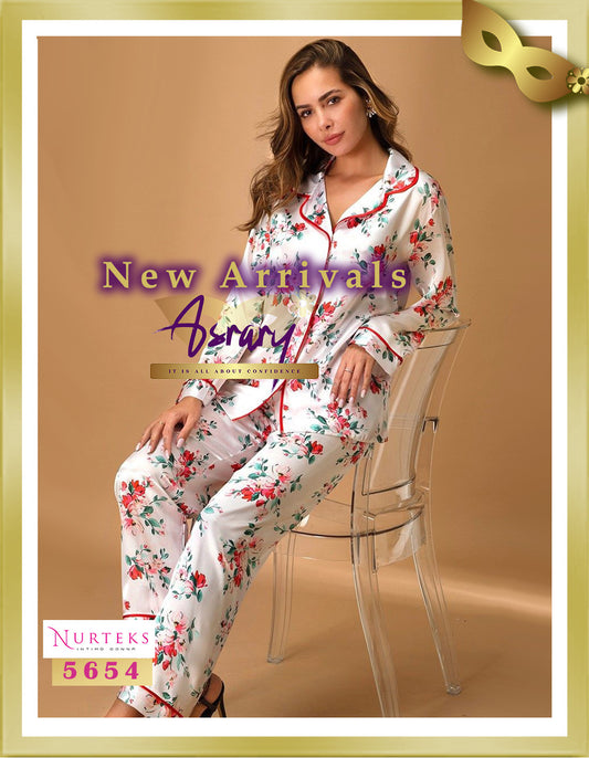 بيجامة ستان لانجيري مع دانتيل طويلة 5665